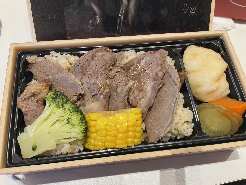 ビーフジャーキーのような硬さ、想像するステーキ弁当とはほど遠いです。ひどいの一言だけです。