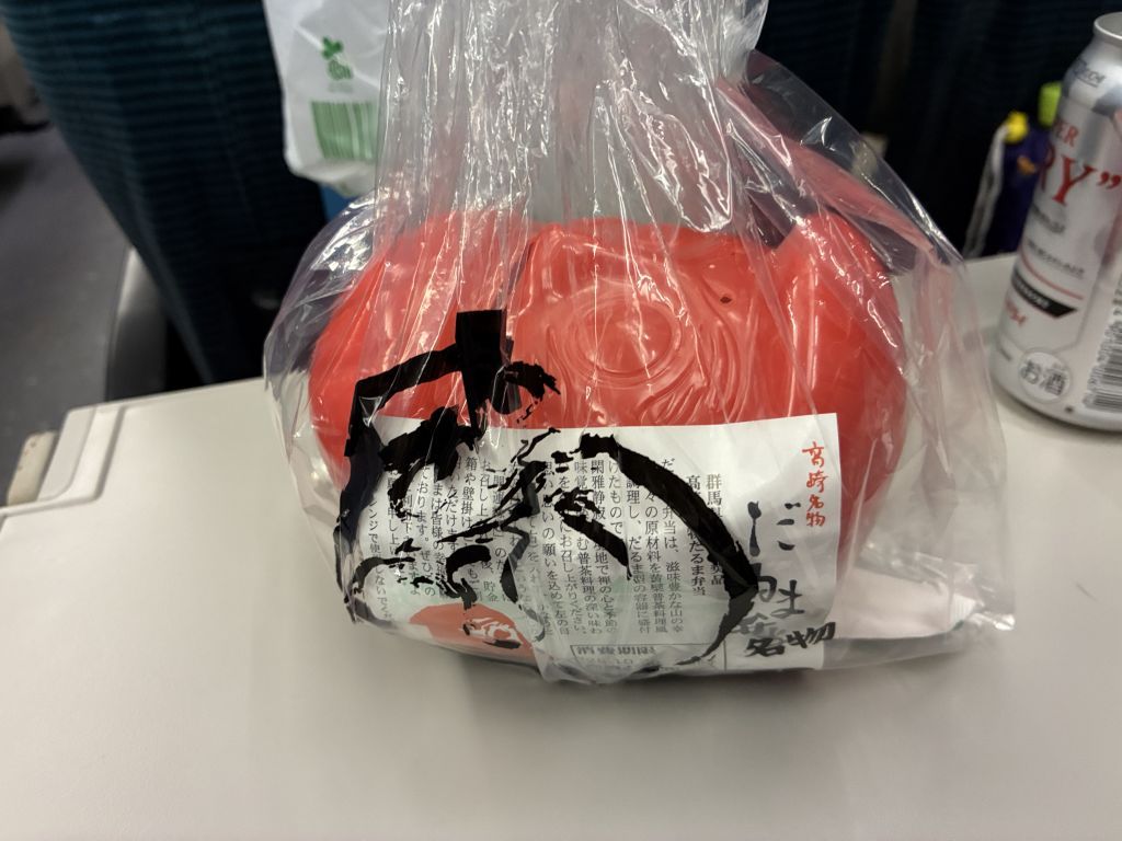 ダルマ弁当高崎弁当株式会社¥1,400手前から食べ始めてサイコロ型のこんにゃく二個細いザーサイ数本クリ一個(甘い)煮豆一個(めちゃ甘い)ゴボウの鶏肉巻き一枚ミニナス丸ごと漬物一個味付き鶏肉の薄切り一枚ゴボウの漬物三枚小さな椎茸の煮物一個塩加減少なめの山菜漬け二十本程度筍(たけのこ)の煮物少し甘め一切れ手前から順番に食べて行くと、違った美味しさが順番に攻めて来る更に出汁の効いた固めのご飯はそのまんま食べても美味しかつた最後まで全く飽きない見事な駅弁だった‼️