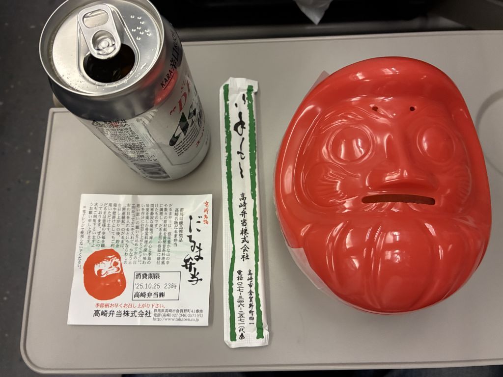 2025年10月25日ダルマ弁当高崎弁当株式会社¥1,400手前から食べ始めてサイコロ型のこんにゃく二個細いザーサイ数本クリ一個(甘い)煮豆一個(めちゃ甘い)ゴボウの鶏肉巻き一枚ミニナス丸ごと漬物一個味付き鶏肉の薄切り一枚ゴボウの漬物三枚小さな椎茸の煮物一個塩加減少なめの山菜漬け二十本程度筍(たけのこ)の煮物少し甘め一切れ手前から順番に食べて行くと、違った美味しさが順番に攻めて来る更に出汁の効いた固めのご飯はそのまんま食べても美味しかつた最後まで全く飽きない見事な駅弁だった満足の満点