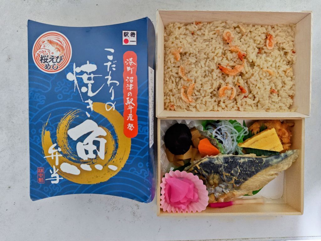 白飯とおかずが二段重ねになっています。おかずは、駅弁とは思えないくらいに大きな銀鮭西京焼き、香ばしい桜えびのかき揚げ、野菜の煮物などです。白飯は、蓋も含めて経木の器に入っており、とてもおいしいです。銀鮭は小骨が取り除かれているし、ちょっとしたところにこだわりを感じます。桜えびのかき揚げが、煮物などの水分を吸って水っぽくなってしまっているのが残念ですが、これはやむを得ないですかね。