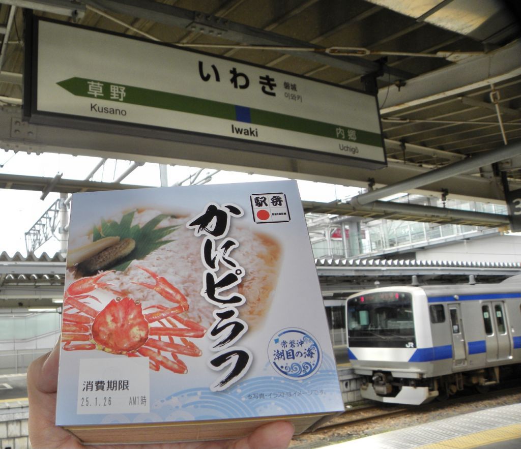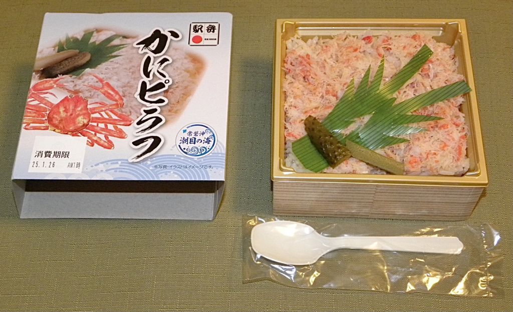 いわき駅売店で購入しました。同駅での駅弁販売を引き継いだ小名浜美食ホテルの商品です。かにピラフはいわきの名物だそう。正方形のお弁当箱の中には蟹のほぐし身がびっしり。付け合わせのピクルスが大きく、噛むほどに味が広がるのもまた楽しさです。