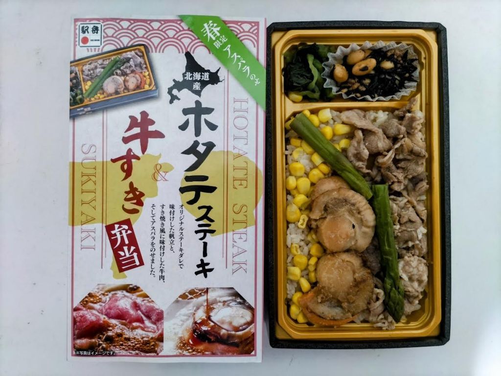 ホタテステーキ牛すき弁当の駅弁の価格情報や、ホタテステーキ牛すき弁当を実際にを食べたユーザーの感想・クチコミ、ホタテステーキ牛すき弁当はどこの駅で購入できるか等の販売情報をご案内します。