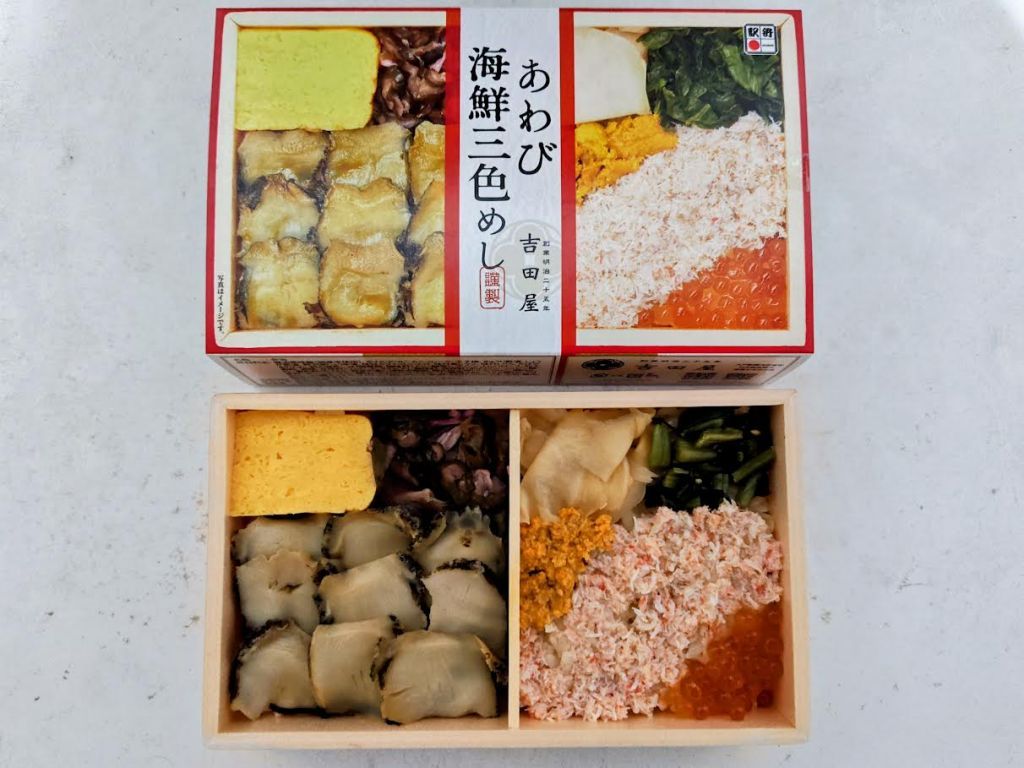 片側にはアワビのスライスを敷き詰め、もう片側にはウニ・イクラ・カニを並べた駅弁。