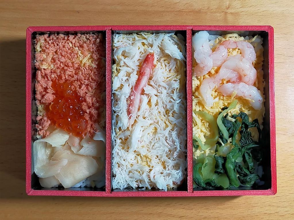 3つに仕切られたお弁当箱には、それぞれ甘えび、かに、いくらが入っています。特にいくらの部屋は錦糸玉子・鮭フレーク・いくらの「親子丼」になっていて、満足度が高いです。