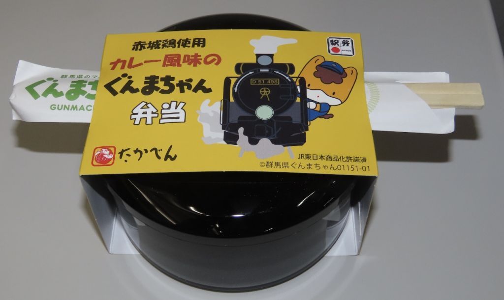 群馬県のマスコットキャラクター【ぐんまちゃん】をモチーフとした駅弁です。ドライカレーご飯の上に載せられた具材のうち、タンドリーチキンは群馬県産の赤城鶏が使われており、コレがナカナカ美味しくて、カレーご飯と共に食が進みます。焼かまシートには、ぐんまちゃんの顔がプリントされていますよ。