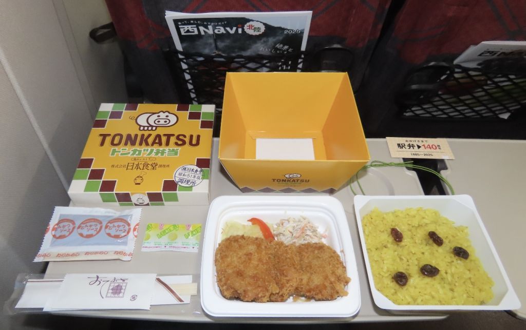 駅弁発祥から140年という節目の年とされる今年(2025年)に、昭和の駅弁が復刻発売されました。かつての国鉄時代に、東京駅などで目に出来た懐かしの【日本食堂】のトンカツ弁当!1976年(昭和51年)当時の作品を再現したのだそうですよ。パッケージには、新幹線電車のキャラクターがコック帽をかぶった姿のイラストもあり、実に懐かしい!トンカツは一口サイズのもので食べやすく、コッテリとソースをかけて美味しく戴けました。