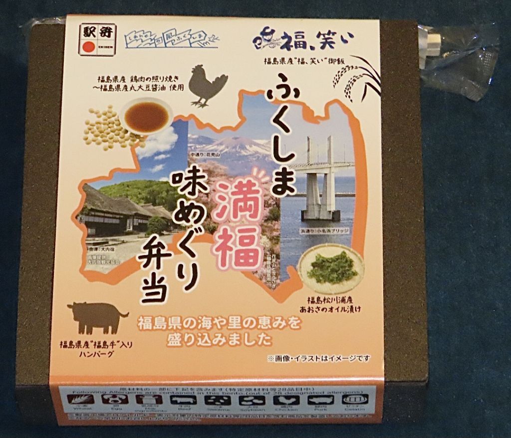 福島県は大きく分けると、JR東北本線が通るあたりの【中通り地方】と、そこから阿武隈高地に隔てられた向こう側(JR常磐線が通るあたり)の海沿い【浜通り地方】、また、中通りから見ると奥羽山脈に隔てられた向こう側(JR磐越西線・只見線が通るあたり)の山に囲まれた【会津地方】との「3っつの地域」がありますが、このお弁当は各々の地方の旨いものが詰められた駅弁です。中でも、福島県産の「福、笑い」と名付けられたご飯は、開発に14年の歳月が掛けられたものだそうですが、これがもっちりしていてトッテモ美味しい!また、デザートとして添えられた、会津名物の甘酒入り天ぷらまんじゅうも、香ばしくて美味!満足感の高い駅弁に思えました。