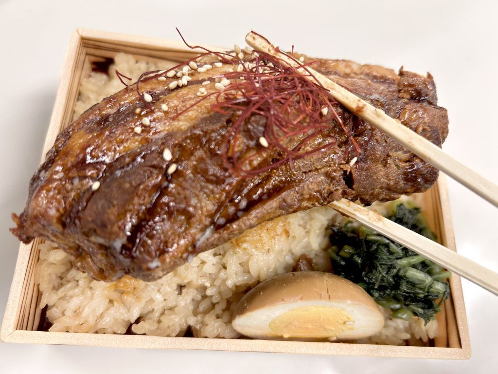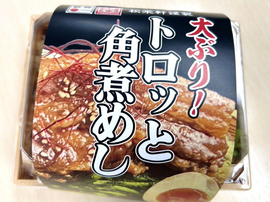 鹿児島県産の黒豚や黒毛和牛を使った駅弁が人気の調製元「松栄軒」が手掛ける一品。200g超えの鹿児島県産黒豚の角煮を豪快にのせた、まさに“でかネタ”を体現した駅弁です。