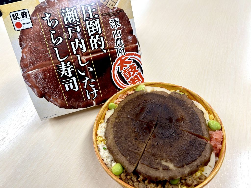 “幕の内駅弁の元祖”ともいわれる老舗調製元「まねき食品」による一品。 圧倒的な存在感のジャンボしいたけの下には、焼き穴子、海老甘酢漬け、干し海老、味付け鯛のほぐし身など、彩り豊かなちらし寿司が詰まっています。