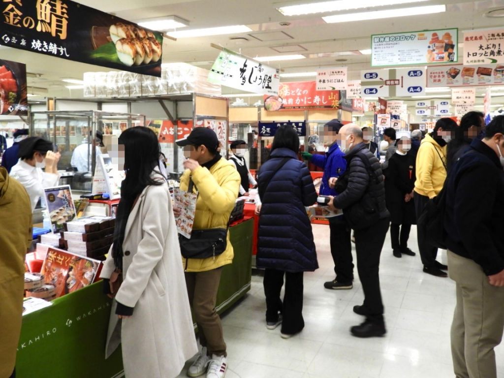 今年もD1「輸送駅弁コーナー」は大盛況。開場前から多くの来場者が列をなし、7階の催事場から5階まで列が伸びるほどの長蛇の列となっていました。