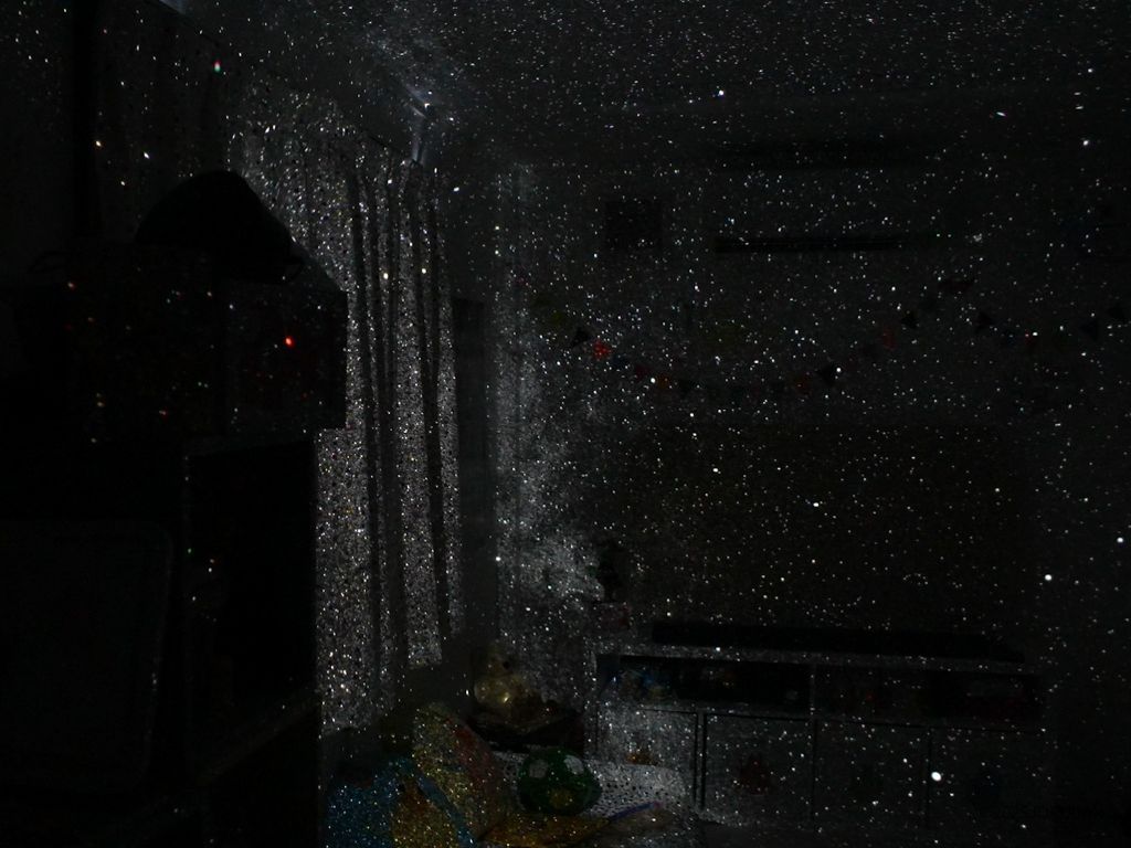 イベント会場は、警告メッセージ「この先、大変不快となっております」に迎えられたトレーラーハウス。中に入ると、そこはまるで星空のような幻想的なイルミネーションが広がる、可愛らしい子ども部屋です。電気を消せば、星々が輝く夜空のような空間が広がります。