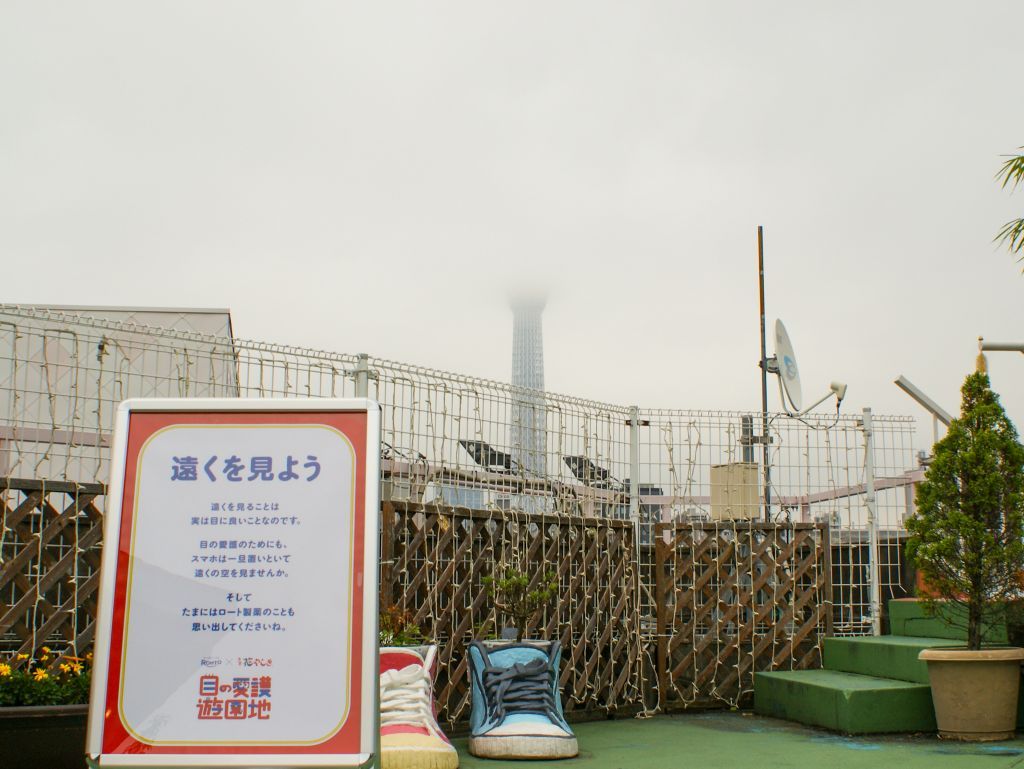 フォトスポットだけではなく、目にやさしい取り組みとして園内各所に「○○を見よう」パネルが点在しています。例えば、浅草花やしき・スカイプラザ屋上には東京スカイツリー(R)や浅草の街並みが一望できるスポットが。「遠くを見よう」のパネルと一緒に浅草の風景を写真に収めることができます。