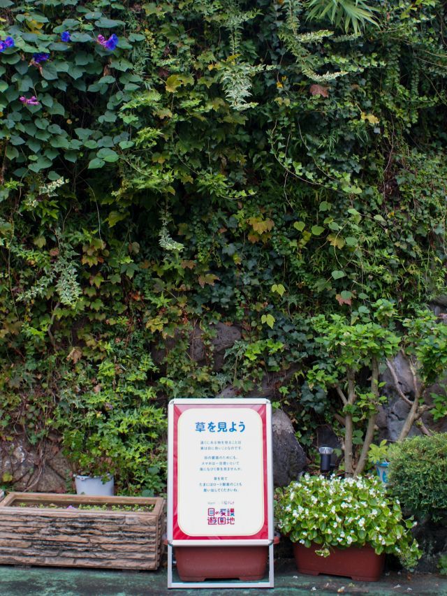 「草を見よう」パネルでは「目の愛護のためにもスマホを置いて、風になびく草を見ませんか。」のメッセージが。目の愛護遊園地、ぜひの~んびり散策を楽しみましょう。
