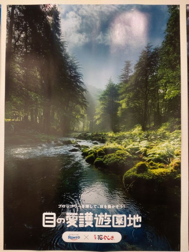 スカイプラザ3Fには目の愛護遊園地のポスターがずらり。ポスターにも見どころが隠されており、木々が目に優しいこのポスターにはなんとブロッコリーブラザーズが隠れています。かなりハイレベルなので、ぜひブロッコリーに含まれるβカロチンを摂取して目を元気にして探しましょう!