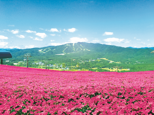 山頂エリアにはペチュニア畑とコキアの花畑がひろがる