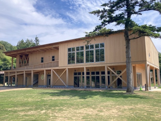 自然と調和した空間で、散策・宿泊・体験が楽しめる新スポットです。園内にはキャンプ広場やRVパーク付きキャンピングカーサイト、宿泊用コテージ、拠点施設「あいうえお学舎」では、1階に無料休憩所「もりのテラス」などがあります。