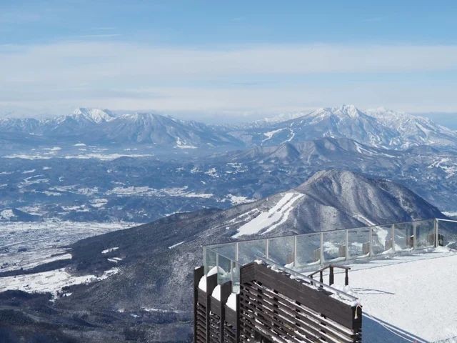 北志賀高原にあるスキー場。山頂エリアでは、標高1930mから絶景を見ながら滑ることができます。「SORA terrace cafe」での休憩もおすすめです。