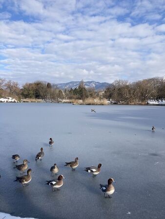 冠雪した伊吹山を背景にマガモやオシドリが飛来する冬の風景は特に美しい。