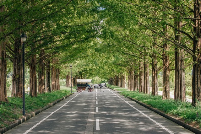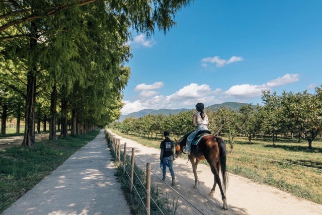 滋賀県の絶景観光スポット「メタセコイア並木」に誕生。並木馬車や乗馬、馬とのふれあいなどの体験ができます。
