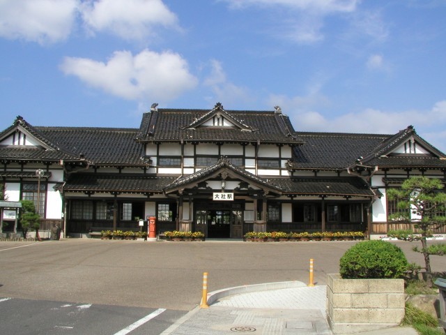 瓦屋根木造神殿風の威風堂々とした建築で、営業駅でなくなった今でも大社の名所の一つだ。六角形に張り出した出札室や和洋折衷のシャンデリアのある待合室などの駅舎内部やホームも当時のまま残る。