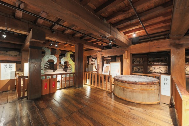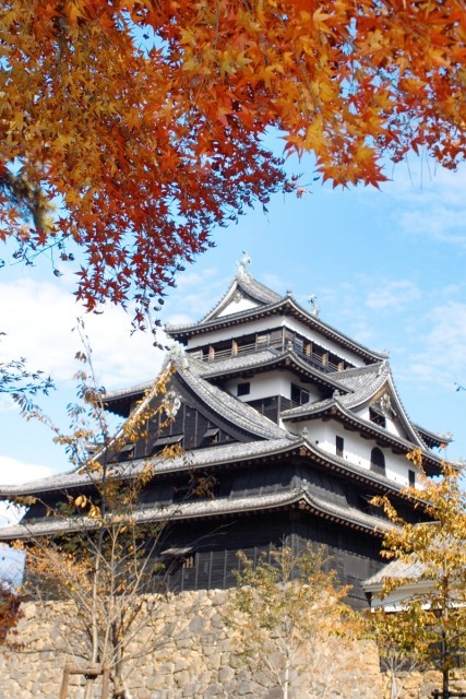 現存する天守閣は5層6階で高さ30m。黒塗りの下見板でおおわれ、同時期築城の姫路城の華麗さに比べると武骨で実戦本位の造り。旧松江藩ゆかりの品を展示した内部にも、石落としなどの実戦を想定した工夫が見られる。最上階の望楼からは松江市街を一望できる。日本100名城。日本三大湖城