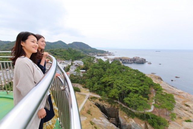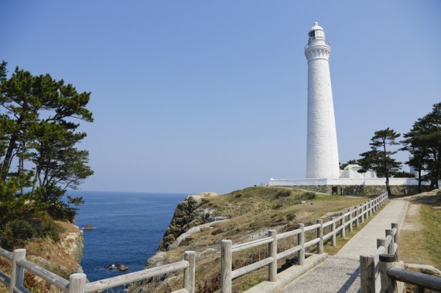 高さ43.65mで、海面からの高さは63.3m。初点灯したのは明治36年(1903)で、今も現役で活躍している。日中は内部が公開されており、らせん階段をたどって上る最上階からは、周囲360度の眺望が楽しめる。灯台資料展示室も隣接している。