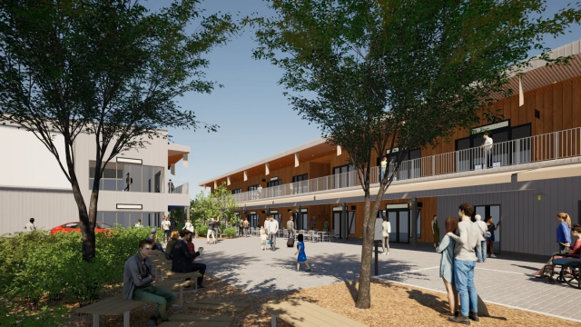 広場や屋外席などの屋外空間を2棟の木造商業施設が共有
