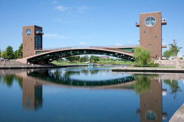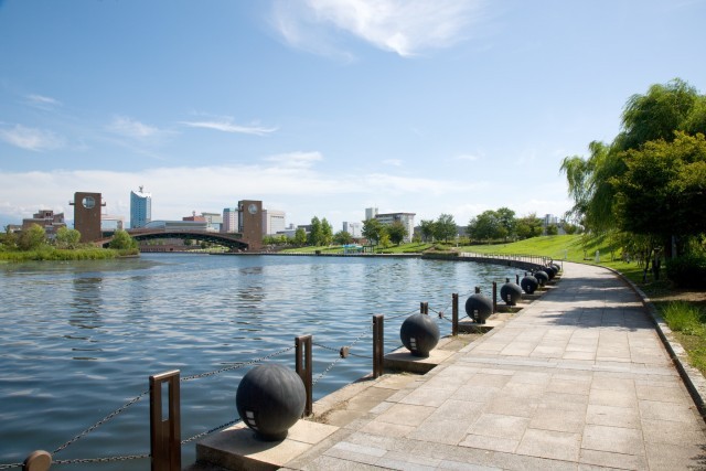 水に親しむ場とし旧舟だまりを利用した水辺空間を中心に、両岸には遊歩道や芝生のスロープを設置し、憩いの公園を演出し、また泉と滝の広場と合わせ、景観的な都市のシンボルをめざしています。