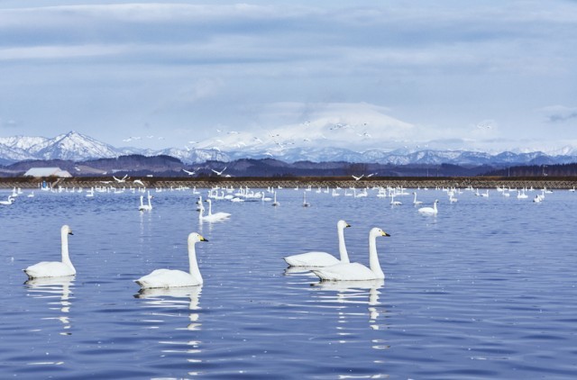 白鳥とともに出羽富士と称される鳥海山の風景を見ることができます。