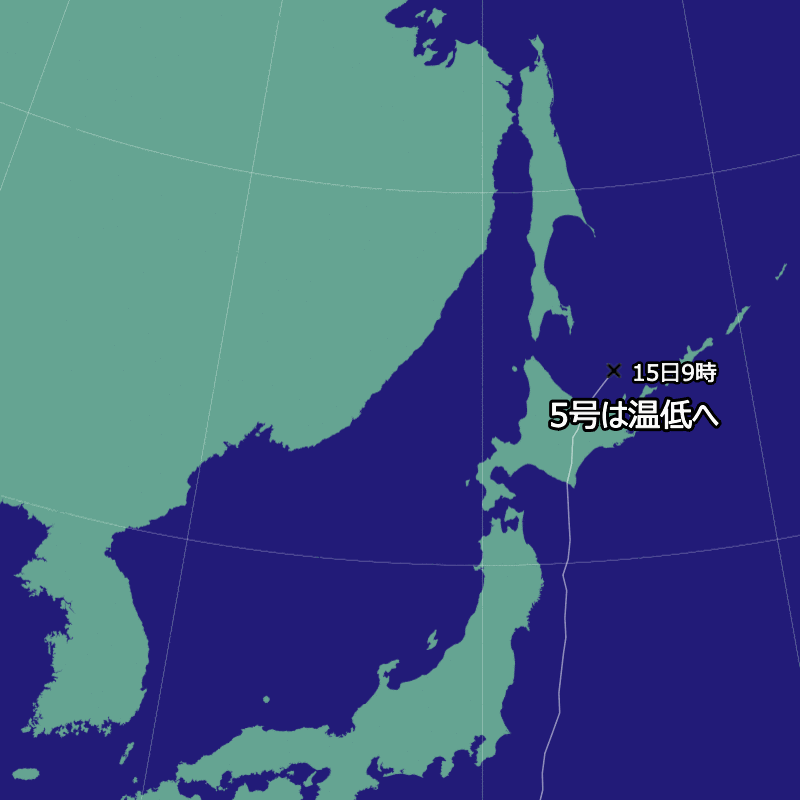 | 7/15 00:00 | 襟裳岬の南約90km | 北 時速55km | 992hPa | 23m/s(最大:35m/s) |