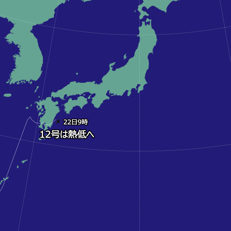 [気象概況]台風第12号は、22日9時に熱帯低気圧に変わり、日向灘をゆっくりした速さで北東へ進んでいます。熱帯低気圧は動きが遅いため、九州南部・奄美地方、九州北部地方や四国地方では、熱帯低気圧周辺の暖かく湿った空気の影響で、大気の非常に不安定な状態が続くでしょう。[雨の予想]九州南部・奄美地方では22日は、雷を伴った激しい雨が降り、大雨となる所があるでしょう。熱帯低気圧の動きが遅いため、同じ地域で雨が降り続いて、総降水量がさらに多くなるおそれがあります。22日12時から23日12時までに予想される24時間降水量は多い所で、九州南部100ミリ奄美地方80ミリ[風の予想]九州南部では22日は強い風の吹く所があるでしょう。22日に予想される最大風速(最大瞬間風速)九州南部15m(23m)[波の予想]九州南部では22日は、うねりを伴い波の高い所があるでしょう。22日に予想される波の高さ九州南部2.5mうねりを伴う[防災事項]九州南部・奄美地方では鹿児島県を中心に、これまでの大雨により、土砂災害や洪水災害の危険度が高くなっている地域があります。22日は、九州南部では引き続き、土砂災害と河川の増水や氾濫に厳重に警戒し、低い土地の浸水に警戒し、強風やうねりを伴った高波に注意してください。奄美地方では土砂災害に厳重に警戒してください。また、九州南部・奄美地方、九州北部地方や四国地方では、落雷、竜巻などの激しい突風に注意してください。発達した積乱雲の近づく兆しがある場合には、建物内に移動するなど、安全確保に努めてください。