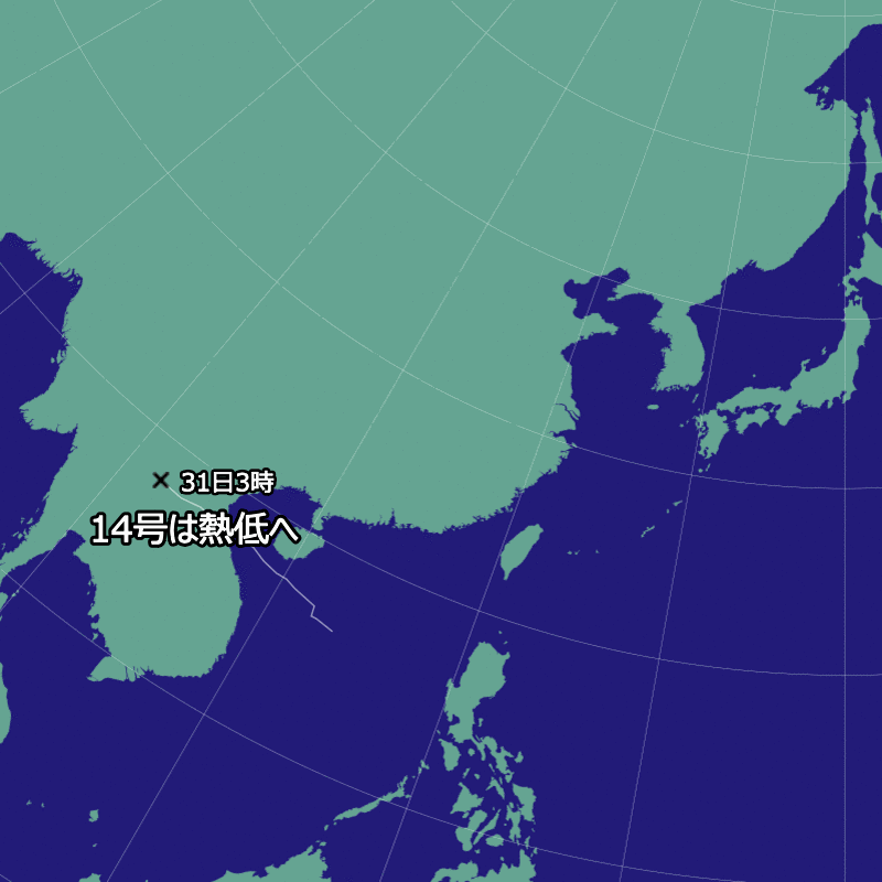 30日9時、トンキン湾の北緯17度55分、東経107度55分において、熱帯低気圧が台風第14号になりました。台風は1時間におよそ30kmの速さで西北西へ進んでいます。中心の気圧は996hPa、中心付近の最大風速は18m、最大瞬間風速は25mで中心から半径280km以内では風速15m以上の強い風が吹いています。台風の中心は、12時間後の30日21時にはラオスの北緯18度00分、東経104度50分を中心とする半径75kmの円内に達する見込みです。中心の気圧は996hPa、中心付近の最大風速は18m、最大瞬間風速は25mが予想されます。
